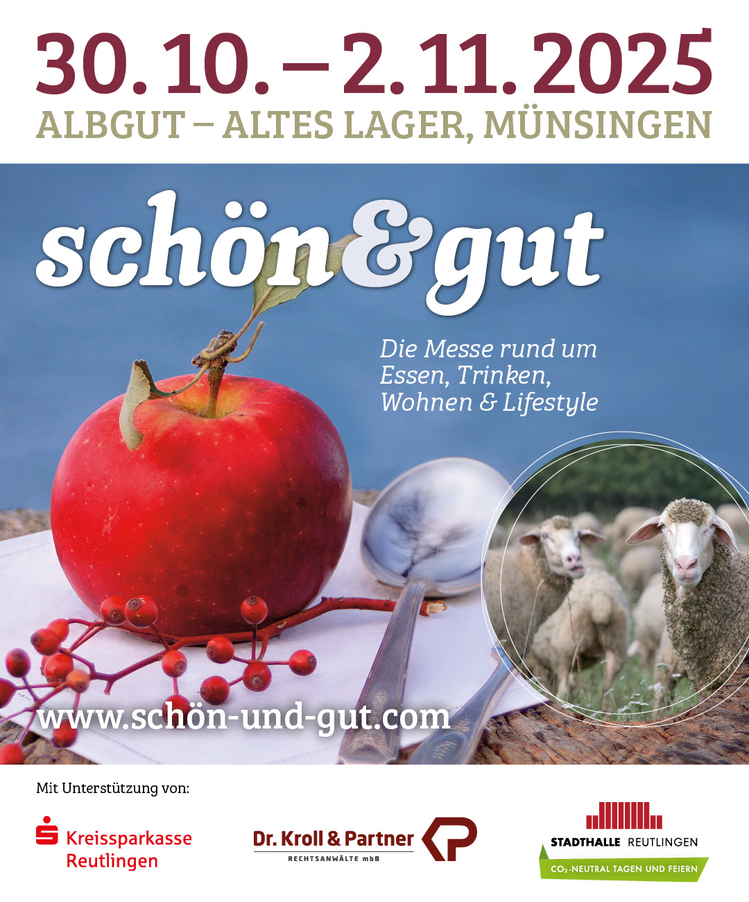Von Donnerstag, 30. Oktober bis Sonntag, 02. November 2025 findet sie nun schon zum 17. mal statt: die Messe „schön&gut“ im albgut in Münsingen. Und diesmal ist die WeinKultur mit dabei! Ausgewählte Aussteller präsentieren dort regionale und internationale Spezialitäten für Augen und Gaumen, Neues und Inspirierendes zu Tisch- und Wohnkultur, Sinnliches und Feines zum Wohlfühlen. Die ehemaligen Kornspeicherhallen bilden eine stimmungsvolle Kulisse mitten im Biosphärengebiet der Schwäbischen Alb. Einfach mal vorbei schauen, wir freuen uns auf euch!